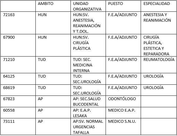 1- Detalle de las plazas para proceso selectivo OPOSICIÓN (plazas de difícil cobertura): La Administración presenta un borrador con las siguientes 8 plazas de dificil cobertura que serán convocadas mediante el sistema de elección de Oposición: