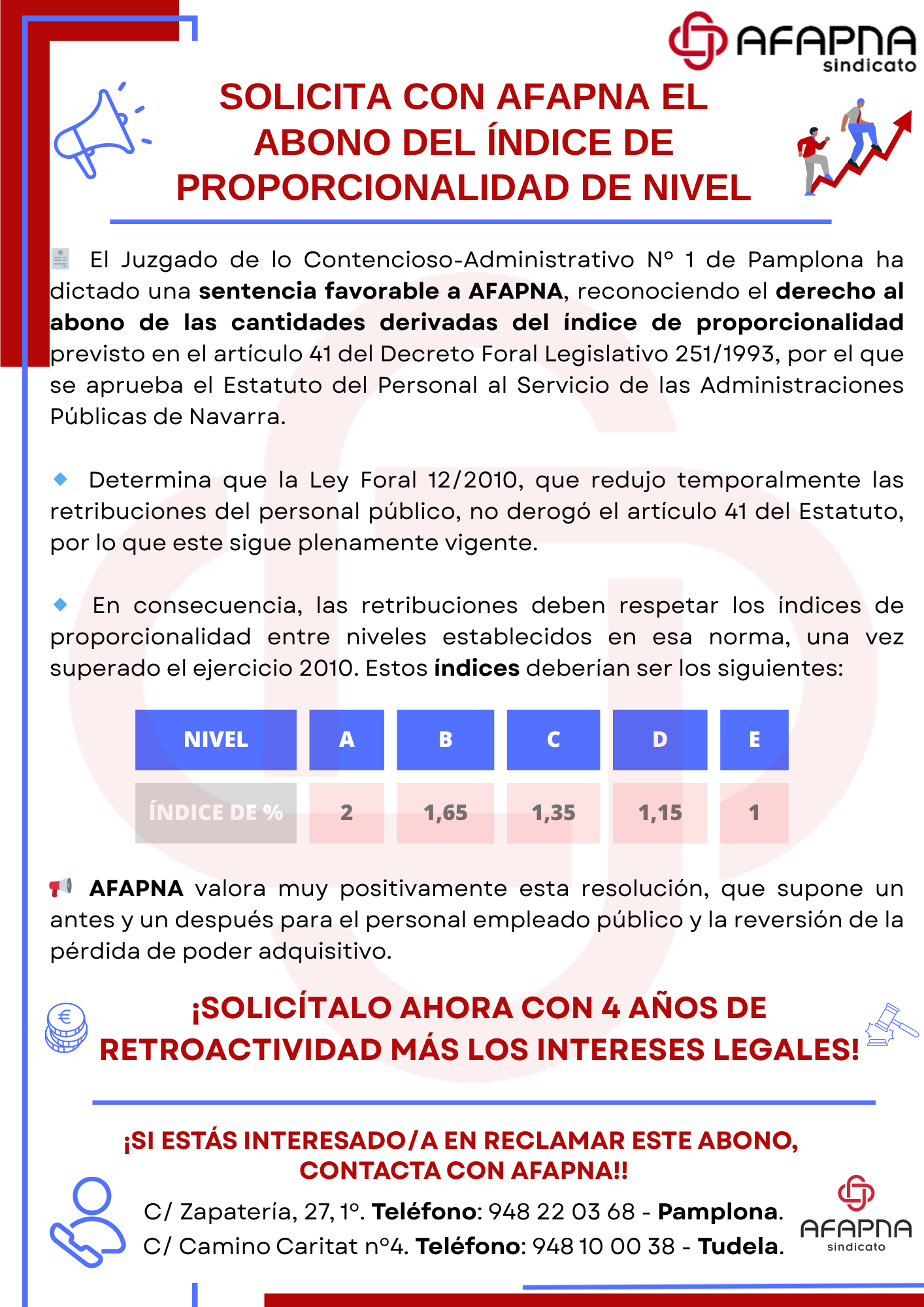 Desde el sindicato AFAPNA nos alegra informaros sobre la sentencia favorable a nuestro sindicato, que reconoce el derecho al abono de las cantidades derivadas del índice de proporcionalidad previsto en el Estatuto del Personal al Servicio de las Administraciones Públicas de Navarra.
